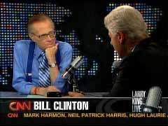 Bill Clinton's appearance on Wednesday's Larry King Live gave new life to the old nickname for CNN as the "Clinton News Network." King fawned over Clinton during the 40-minute session, asking the impeached former President if Osama bin Laden was ever going to caught. After Clinton gave the standard Democratic line that not enough resources are being sent to Afghanistan in the hunt for the al Qaeda leader, King insisted: "You almost got him." Clinton answered affirmatively, and fretted that he "never had a chance to deploy large numbers of troops to Afghanistan." On the Larry Craig sex scandal, King wanted to know if Clinton was gloating or felt any vindication: "Did you get any sense of satisfaction, since he was such a critic of yours during the impeachment thing, and using terms very demeaning about you?" The height of King's fawning over Clinton came when the host wondered, "Would you be happier if history said about you: Bill Clinton, a great philanthropist who happened to be President?"