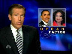 Two days before Oprah Winfrey is to host a celebrity-packed fundraiser for Democratic presidential candidate Barack Obama, NBC's Andrea Mitchell championed her potential ability to "turn her magic into votes for Barack Obama" and ABC's David Wright marveled: "Imagine the power of Oprah in an Obama campaign ad." In a soundbite, Democratic strategist Donna Brazile gushed that "O plus O equals opportunity for Barack Obama to win in 2008." On Thursday's NBC Nightly News, anchor Brian Williams justified his show's story by asserting that Winfrey's "support for him [Obama] is getting new attention" -- attention NBC decided to give the topic. Mitchell admired how Winfrey "can turn a first-time author into an instant best-seller, single-handedly reviving an industry," leading her to wonder: "Can the billionaire entertainer, and richest woman in America, turn her magic into votes for Barack Obama?" Ted Johnson of Variety insisted: "It's a very big deal because Oprah, as we know, does not spread her endorsements lightly." Mitchell concluded by noting how "Oprah was recently ranked the second most admired woman in America. Who was first? Hillary Clinton."